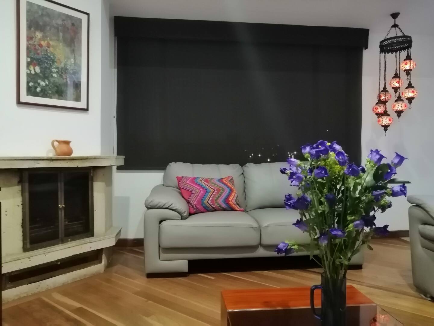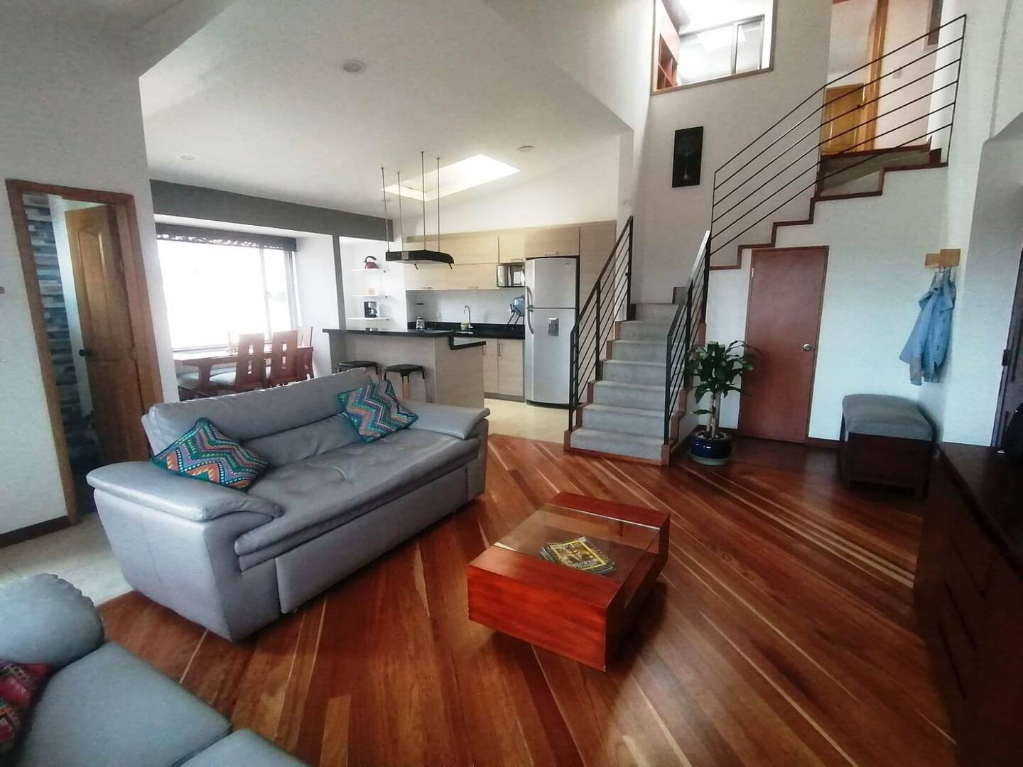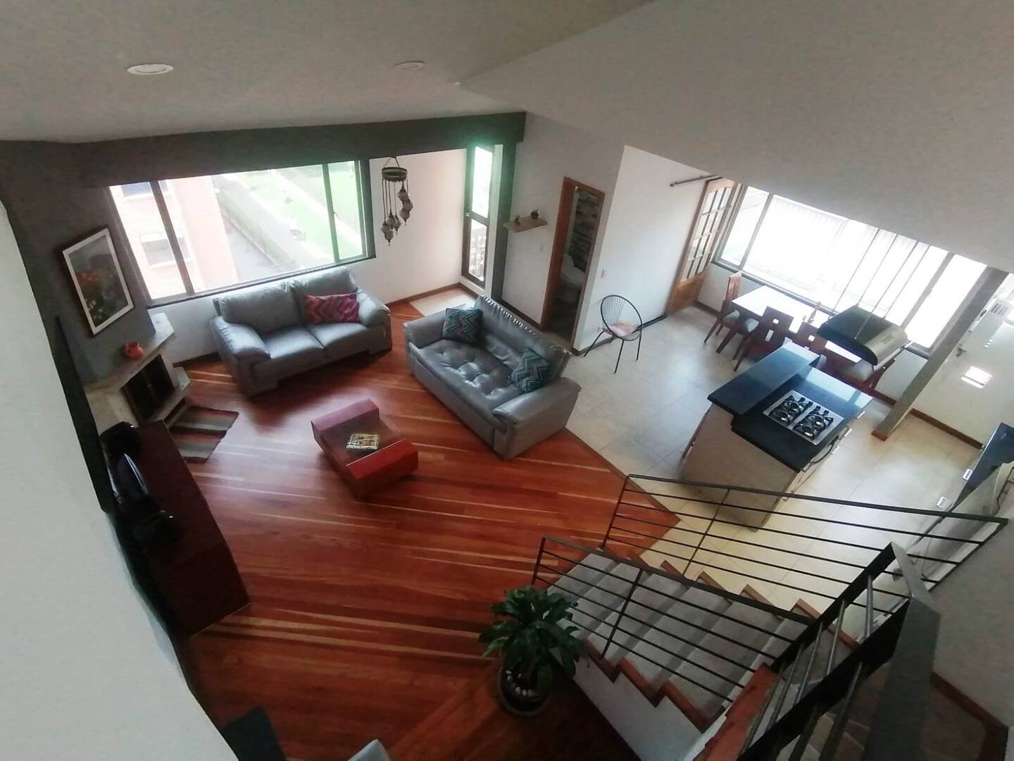 – Primer nivel: Sala amplia con chimenea, un espacio acogedor para relajarte en las noches frías.